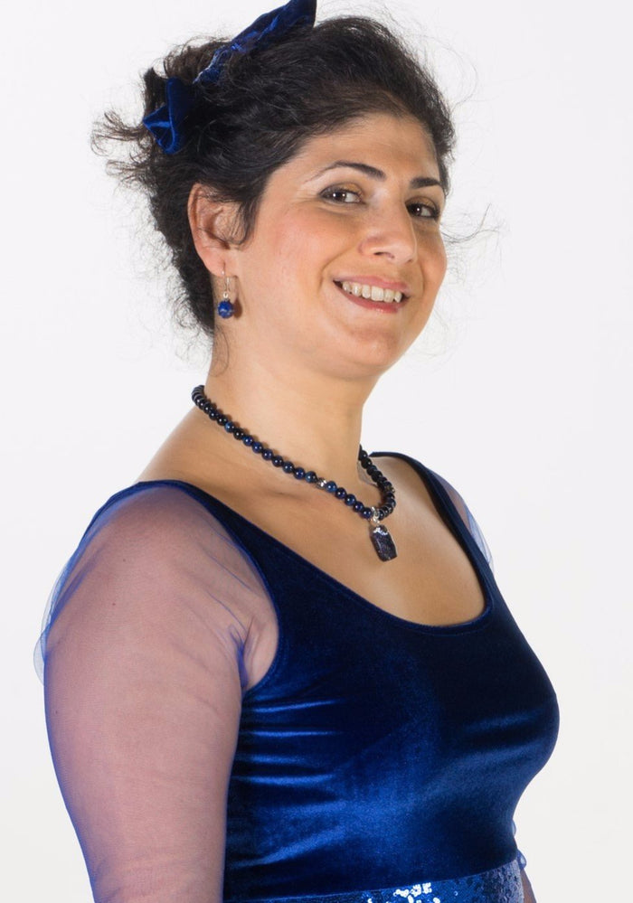 This elegant necklace complements your velvet matching dresses, especially the pretty Sweet Berry but can also upgrade a simple look with jeans into a shiny one. Wear it with a long chain blue tassel Swing & Rock necklace, for a completely different feel or with blue Agate earrings - check out our Rainbow Drops or Laila lapis lazuli earrings.