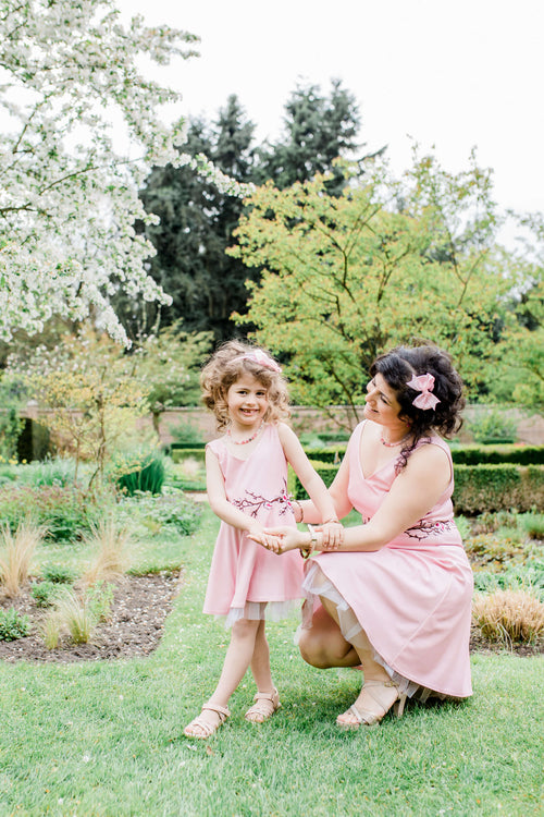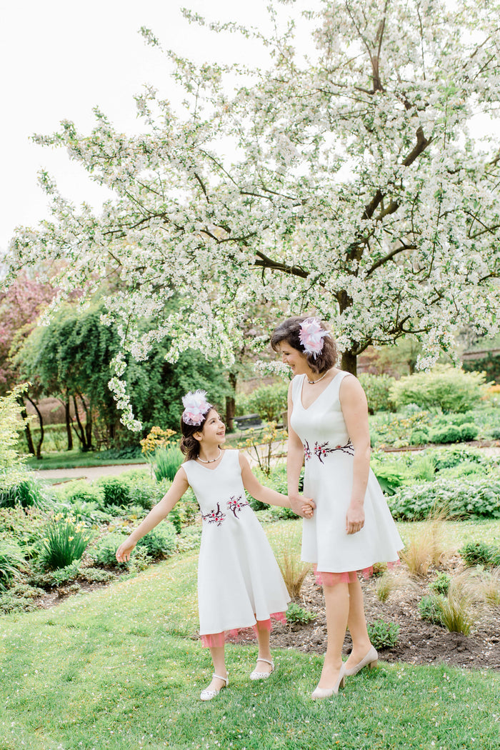 Kijk hoe het gezicht van je dochter opbloeit van liefde wanneer ze haar mooie nieuwe jurk ziet, net als die van mama! Deze bijpassende jurkenset is prachtig en perfect voor een bruiloft, speciale verjaardag of doopfeesten. Het heeft een prachtig sakura-motief geborduurd over de taille en een licht uitlopende rok met een delicate laag tule die onder de zoom uitsteekt.