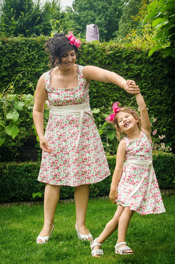 Pretty mommy here wears a size 40 dress in tiny pink tulips print and knee-length A line skirts. Her little flower princess wears size 104. The other mommy is wearing size 38.