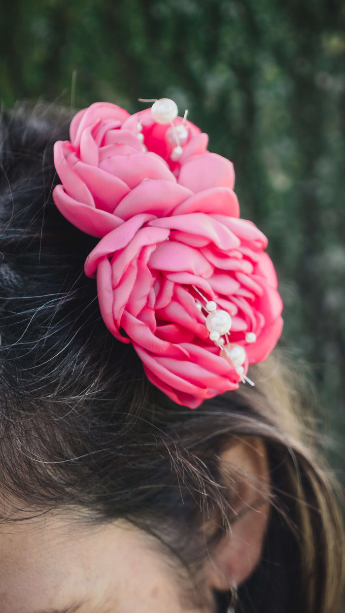 Available in dark pink, purple, black, blue- and now also in soft mint color, this beautiful hair ornament has two medium-size roses made of satin and adorned with imitation pearls inside. You can also select the color of the beads - pearl white, silver, or gold.