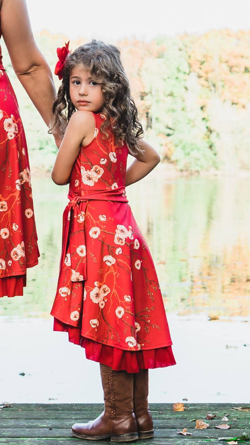 Deze theelange jurk ziet er prachtig uit in rood met crèmekleurige sakurabloesems. Het is een uitstekende keuze voor een speciale gelegenheid met je kleine lievelingen, zoals een bruiloft of verjaardagsfeestje. Het is mouwloos met een geknoopte buste en heeft een hi-low rok met een flirterige ruches. Zeker om vele hoofden rond te draaien!