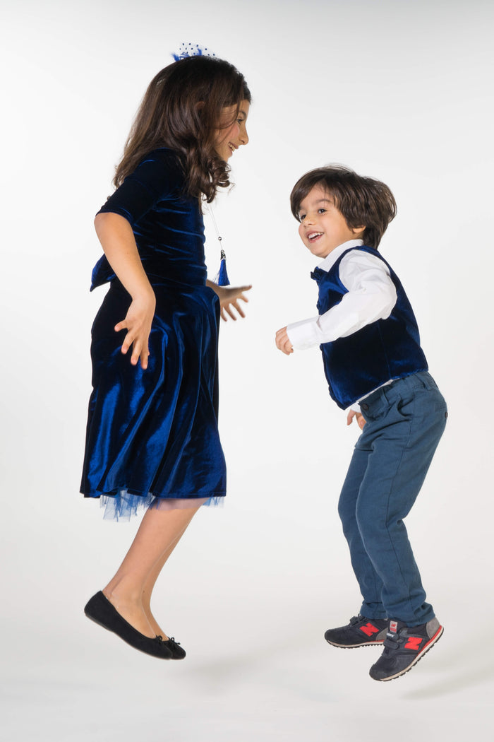 The models you see on the pictures are real mother, daughter, and son:) Little handsome matching his elder sister here, is wearing a blue velvet bow-tie and waistcoat. He is wearing size 110. In the other picture, this almost 5 year-old handsome wears a black velvet waistcoat with a red velvet bow-tie, perfectly matching his pretty mommy and beautiful sister. To order as a set as seen here, go to our Party Handsome set ;)